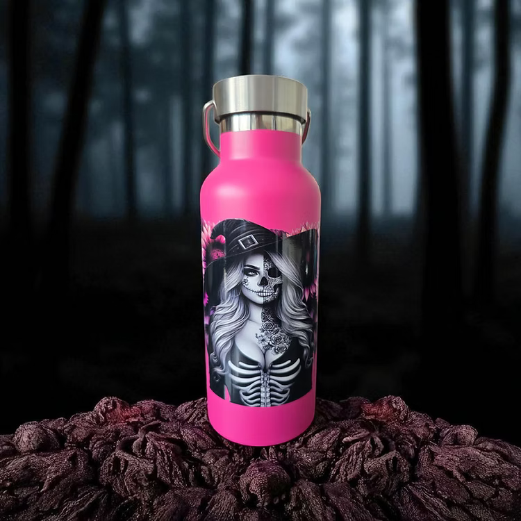Add some spooky style to your hydration routine with this delightfully dark flask that perfectly balances life and death imagery in true gothic fashion!